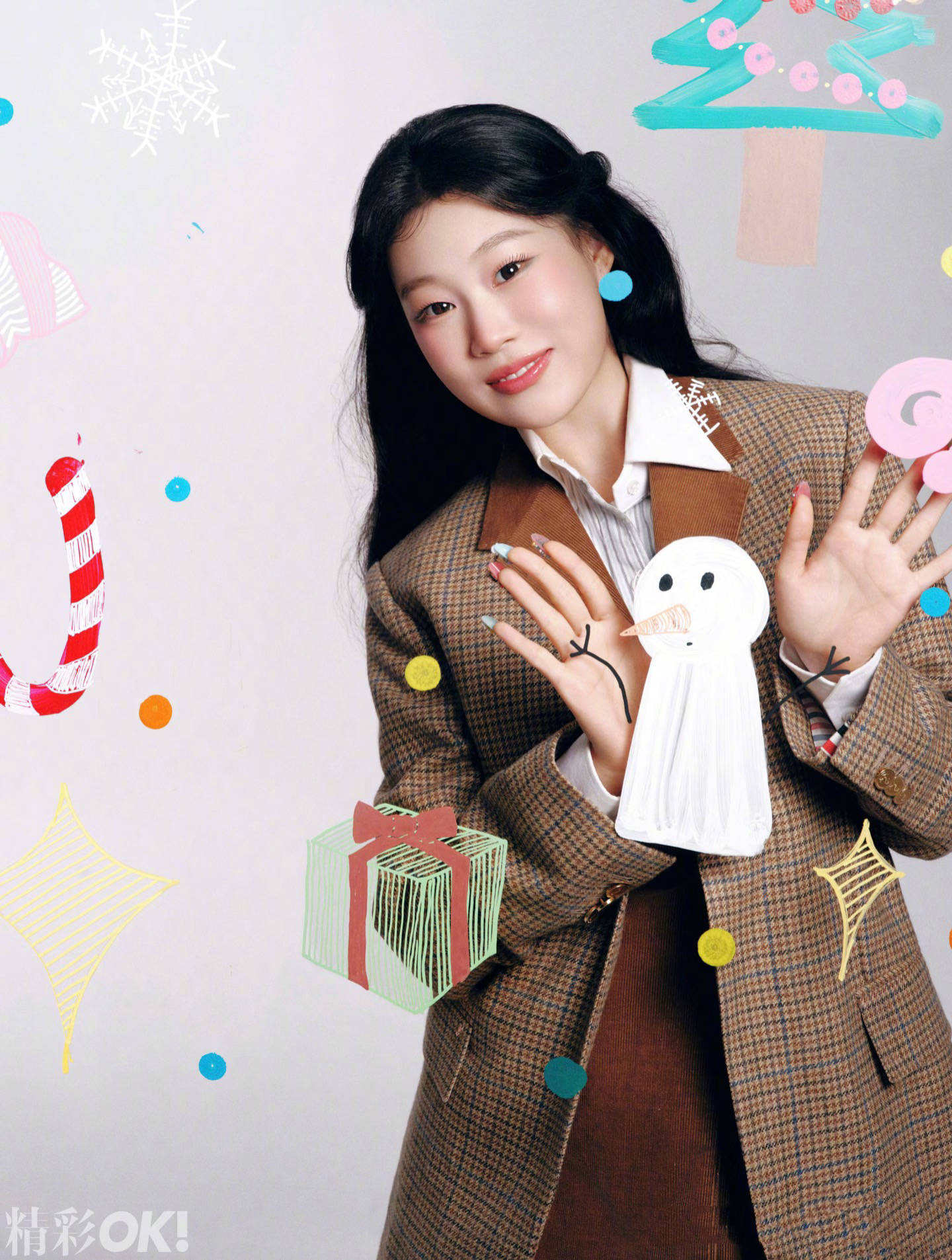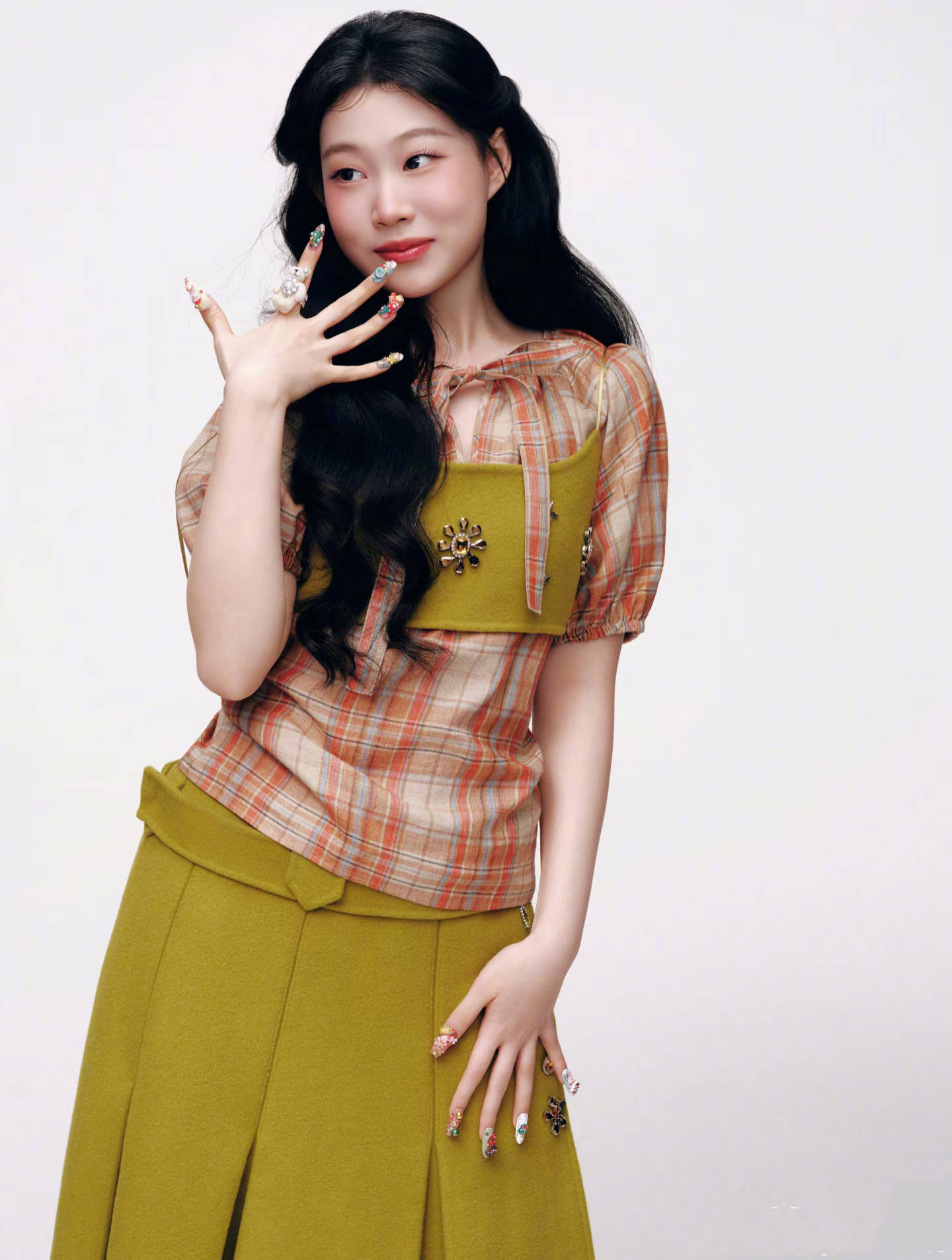 英伦复古的元素,穿在沈佳润身上也没有压力。只是这种棕色格子西服,显得她稍微有点点成熟,整体风格还是很端庄很高级的。