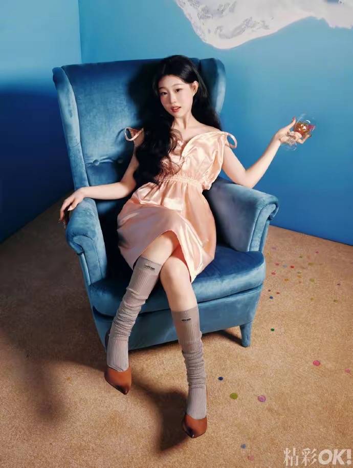香槟色的连衣裙,灰色的长筒堆堆袜,复古棕的尖头高跟鞋,这样的一组造型有一种“吾家有女初长成”的感觉,带一点小女生的性感、眼神里也多了几分娇羞。